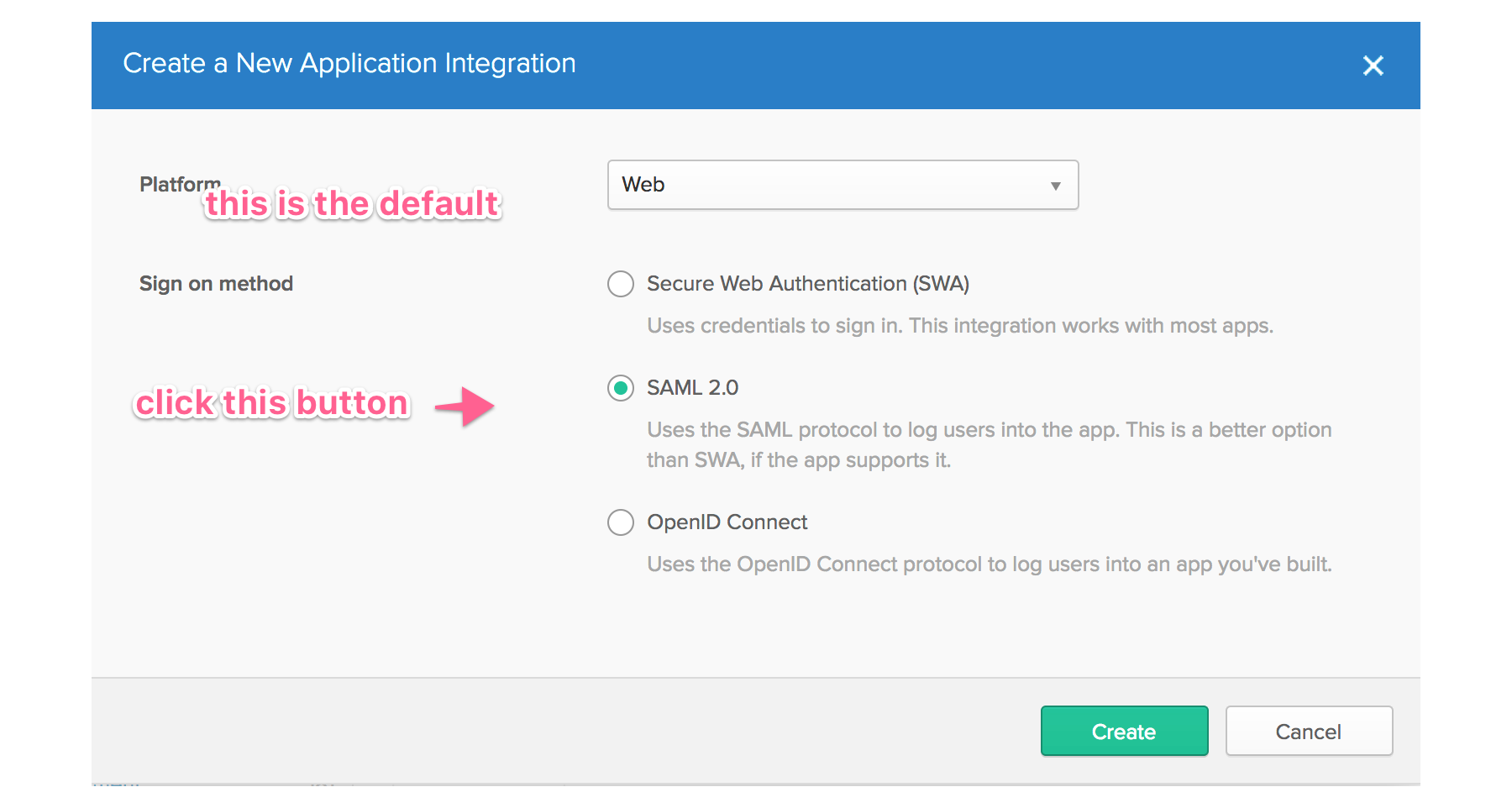 On the Create SAML Integration screen, select I’m an Okta customer adding an internal app and then click the Finish button.