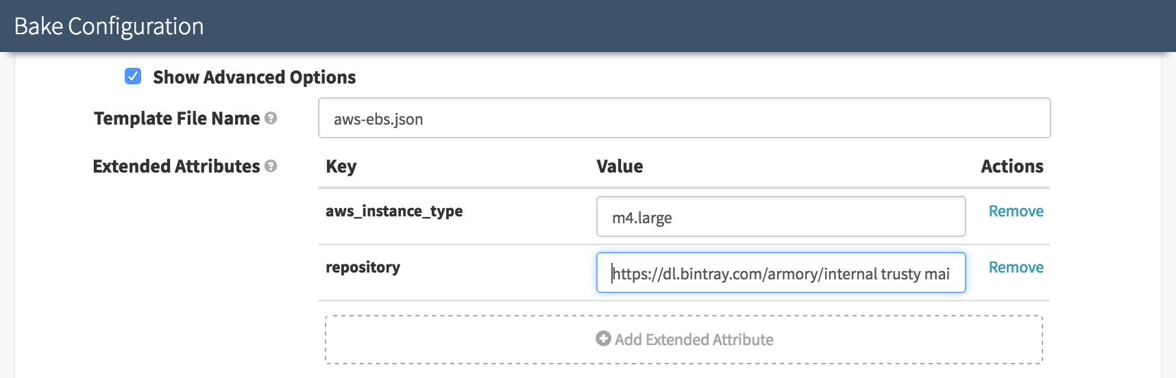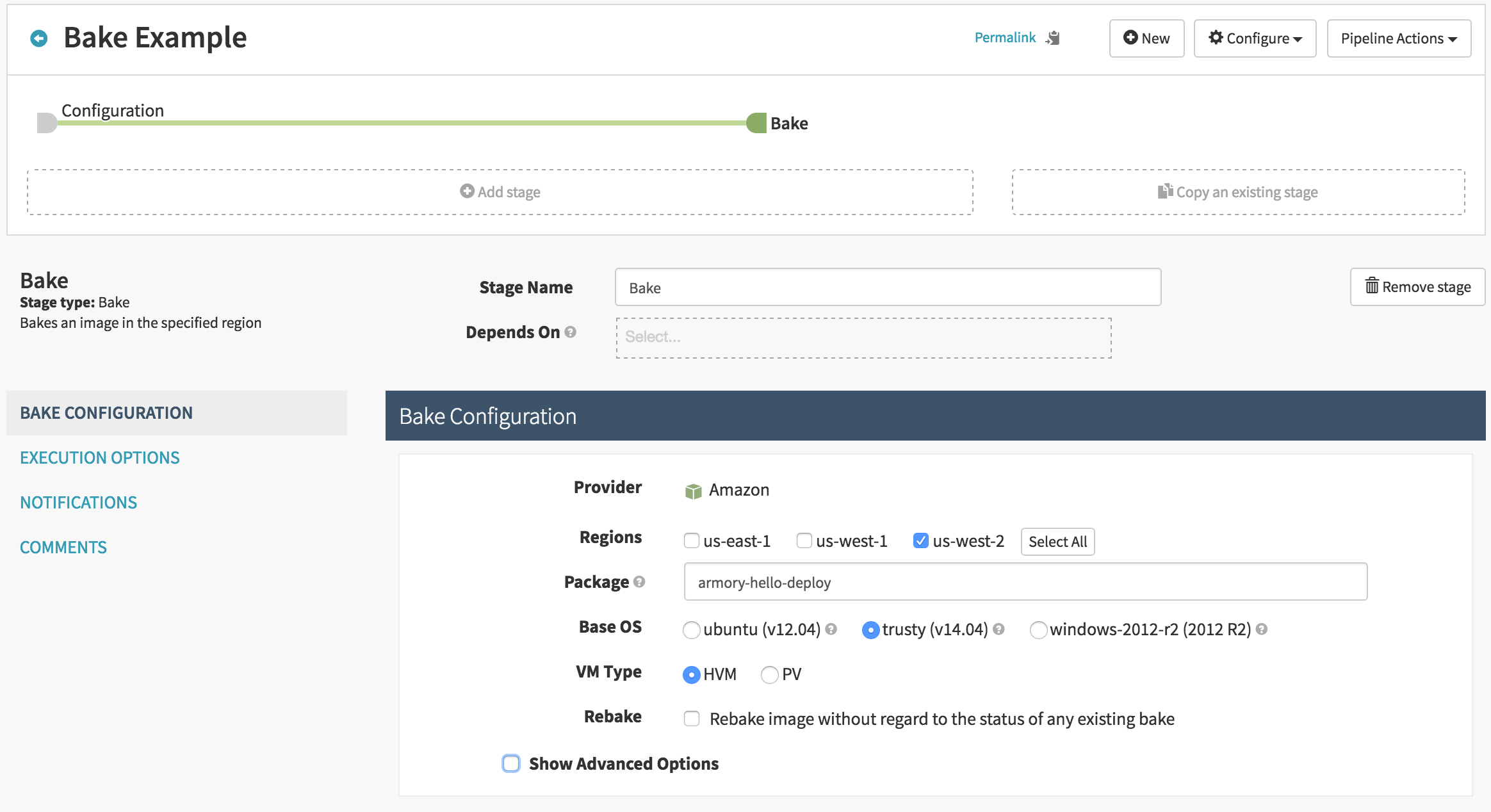 If you would like to change the name in AWS of your AMI, you can do so by selecting the ‘Show Advanced Options’ checkbox in the Bake Stage Configuration. Continuing from our example above, when I see: