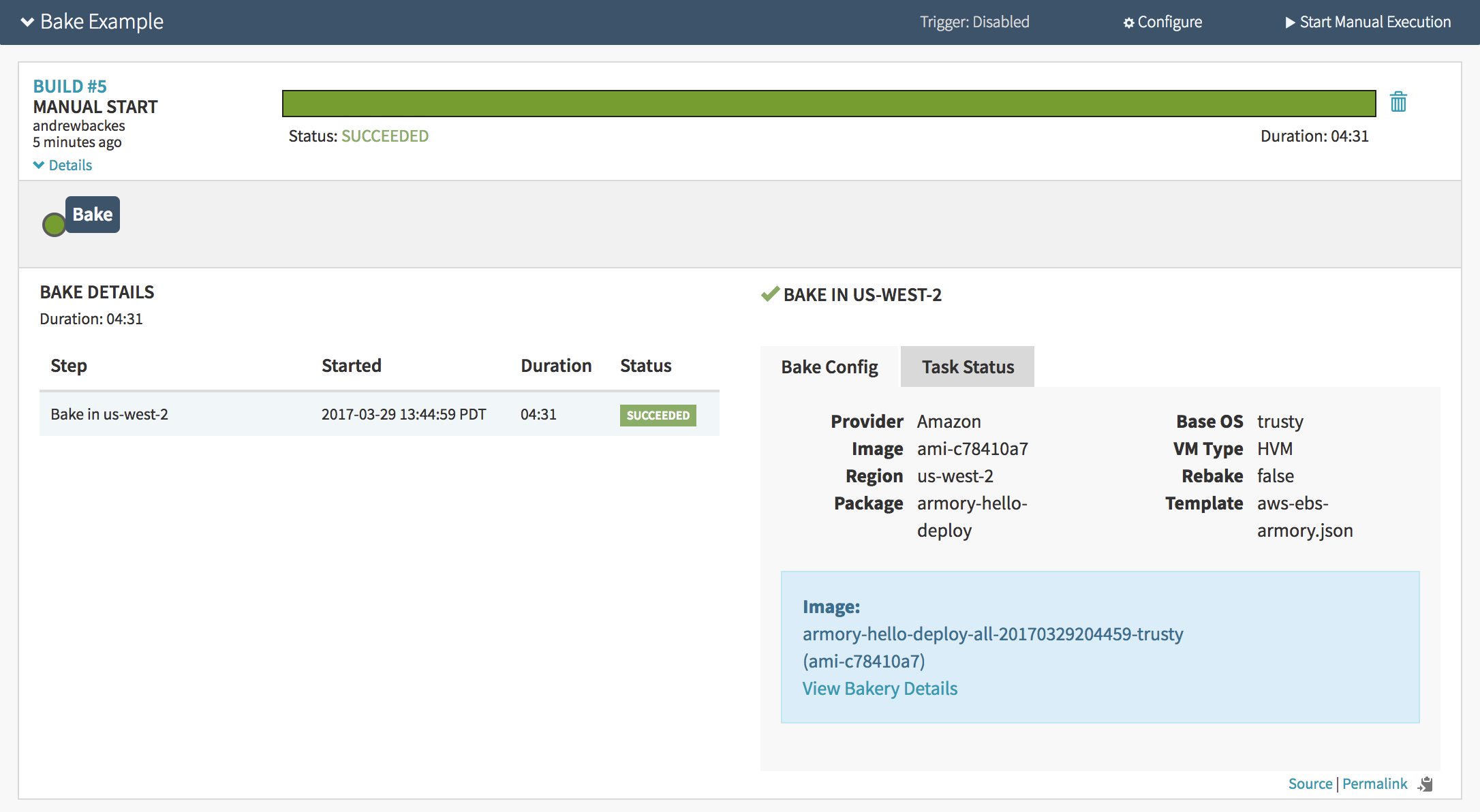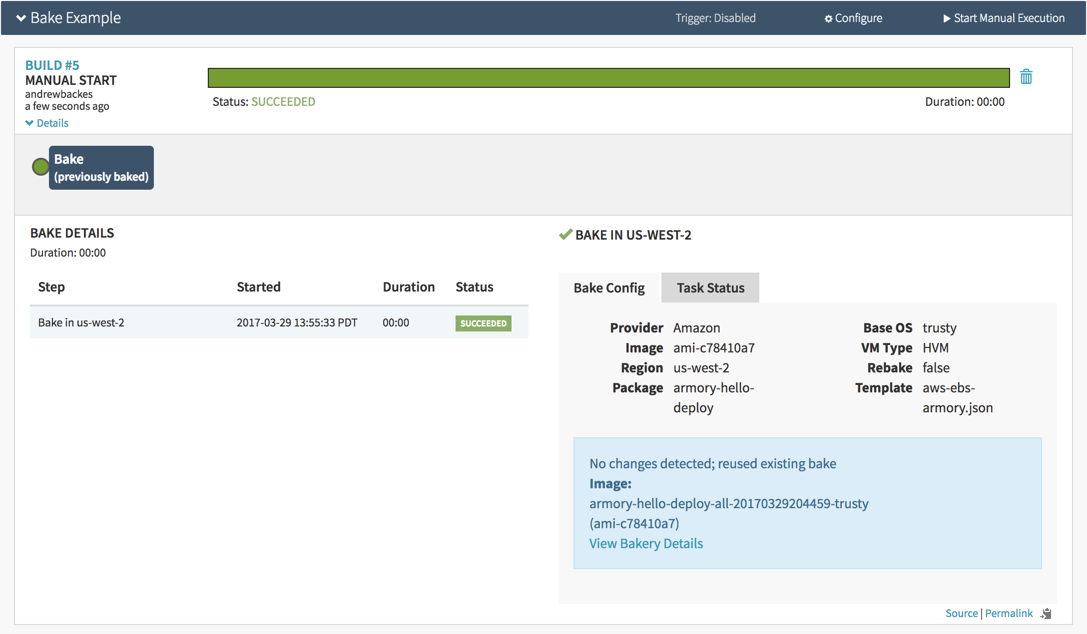 If I press ‘Start Manual Execution’ again, since the package version hasn’t changed, it will reuse the same image rather than rebaking. The screen for that looks like: