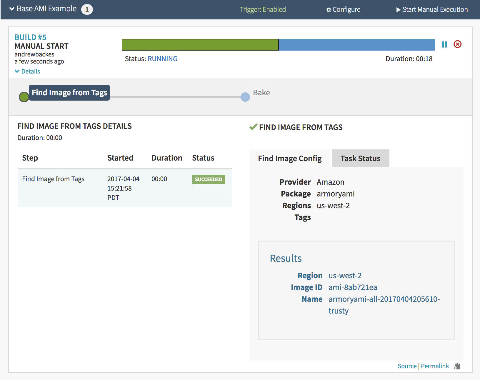 Notice the ‘Results’ box in the lower right hand corner. After inspecting it and comparing it to the bake pipeline in the very beginning of the example, I can see that Spinnaker did indeed choose the correct AMI.