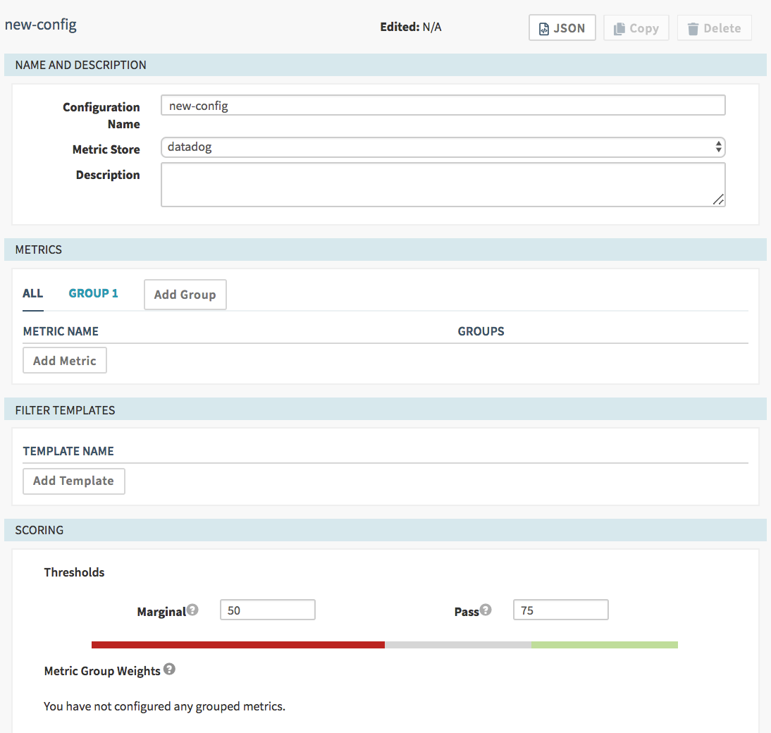 When the canary runs for a given interval, all the metrics are evaluated and each metric is given a pass/fail based on the deviation from the baseline metric. Within a group, each metric is evenly balanced (so if a group has two metrics, and one fails and one passes, the group is scored at 50%; if it had only one metric, it would score either 100% for a pass or 0% for a fail).