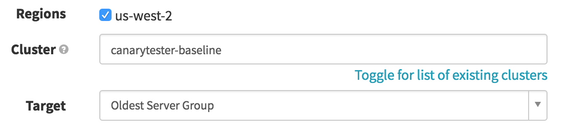 In this stage, we want to find our baseline, based on what’s currently in production. We select our production cluster and then look for the “Oldest” enabled Server Group. This will later be referenced to act as our baseline server group for the canary.